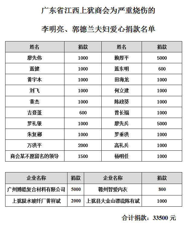 廣東博皓復(fù)合材料有限公司得知消息后,特批從公司愛(ài)心基金里捐出5000元,董事長(zhǎng)賴(lài)厚平個(gè)人捐出5000元。